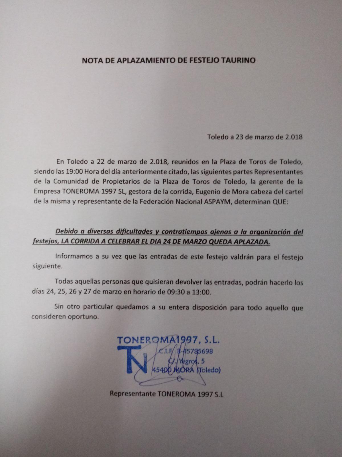 APLAZAMIENTO DE CORRIDA DE TOROS DEL DÍA 24 DE MARZO DE 2018