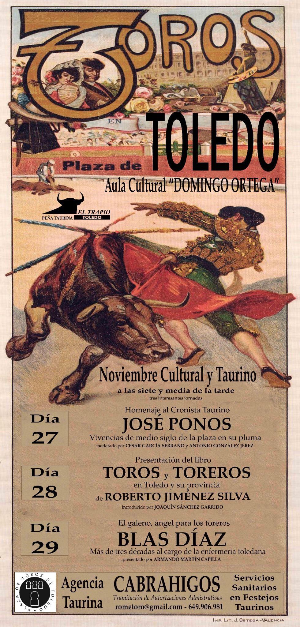 NOVIEMBRE CULTURAL Y TAURINO DÍAS 27, 28 Y 29 A LAS 19:30 HORAS EN EL AULA CULTURAL" DOMINGO ORTEGA" PLAZA DE TOROS DE TOLEDO DÍA 27: HOMENAJE AL CRONISTA TAURINO JOSÉ PONOS DÍA 28: PRESENTACIÓN DEL LIBRO "TOROS Y TOREROS! DE ROBERTO JIMENEZ SILVA DÍA 29: EL GALEANO, ÁNGEL PARA LOS TOREROS, BLAS DÍAZ