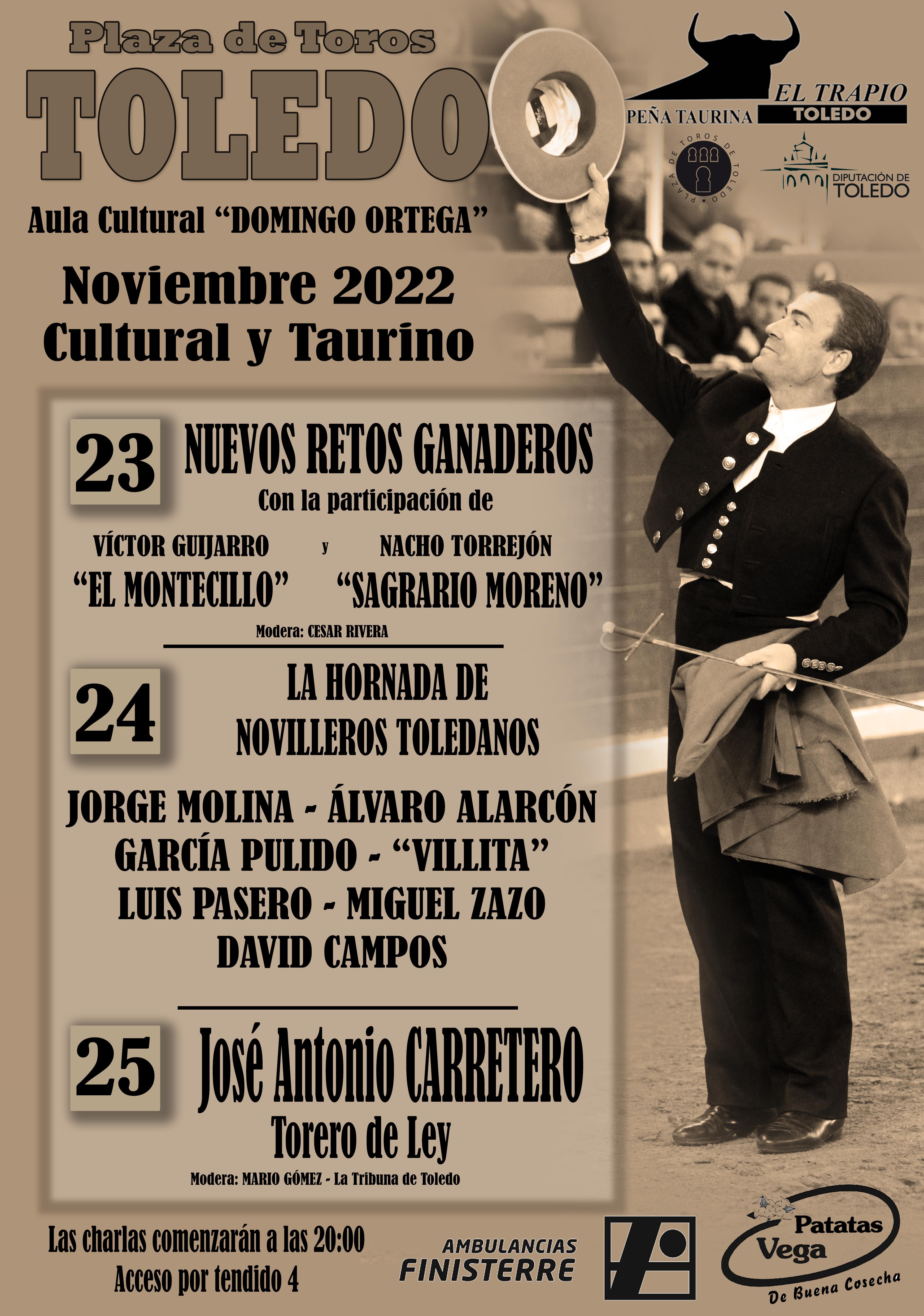 AULA CULTURAL "DOMINGO ORTEGA" NOVIEMBRE 2022 CULTURAL Y TAURINO DÍAS 23, 24 Y 25 DIA 23 NUEVOS RETOS GANADEROS DIA 24 LA HORNADA DE NOVILLEROS TOLEDANOS DIA 25 JOSE ANTONIO CARRETERO TORERO DE LEY Las charlas comenzarán a las 20:00 horas Acceso por Tendido 4