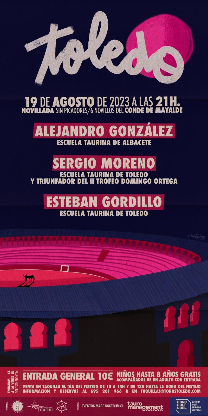 NOVILLADA SIN PICADORES 19 DE AGOSTO DE 2023 / 21 HORAS 6 NOVILLOS DEL CONDE DE MAYALDE SE ENTREGARÁ EL CUPÓN Nº 12 DEL TALONARIO DE ESPECTÁCULOS TAURINOS LUGAR: CONSERJERÍA DE LA PLAZA DE TOROS (Puerta C/Huerfanos Cristinos, frente SESCAM) DÍAS: HASTA DÍA 18 DE AGOSTO (excepto sábados y domingos) HORARIO: 10 a 13:30 / 17 a 19 HORAS