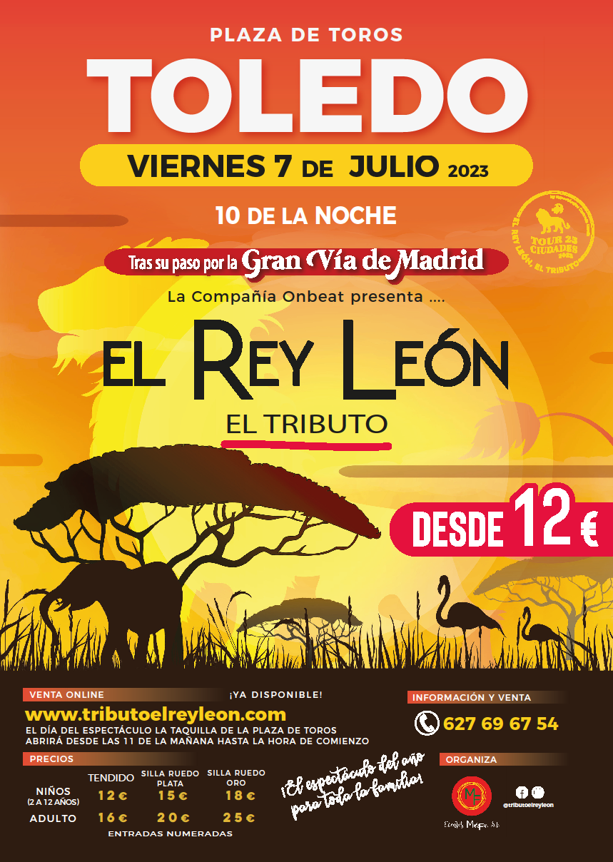 EL REY LEÓN TRIBUTO 7 DE JULIO DE 2023 A LAS 10 DE LA NOCHE CUPON Nº 13 ESPECTÁCULOS NO TAURINOS LUGAR: CONSERJERÍA DE LA PLAZA DE TOROS (Puerta C/Huerfanos Cristinos, frente SESCAM) DÍAS: 28 DE JUNIO AL 5 DE JULIO DE 2023 (ambos inclusive, excepto el sábado y domingo 1 y 2 de julio) HORARIO: 10 a 13:30 / 17 a 19 HORAS