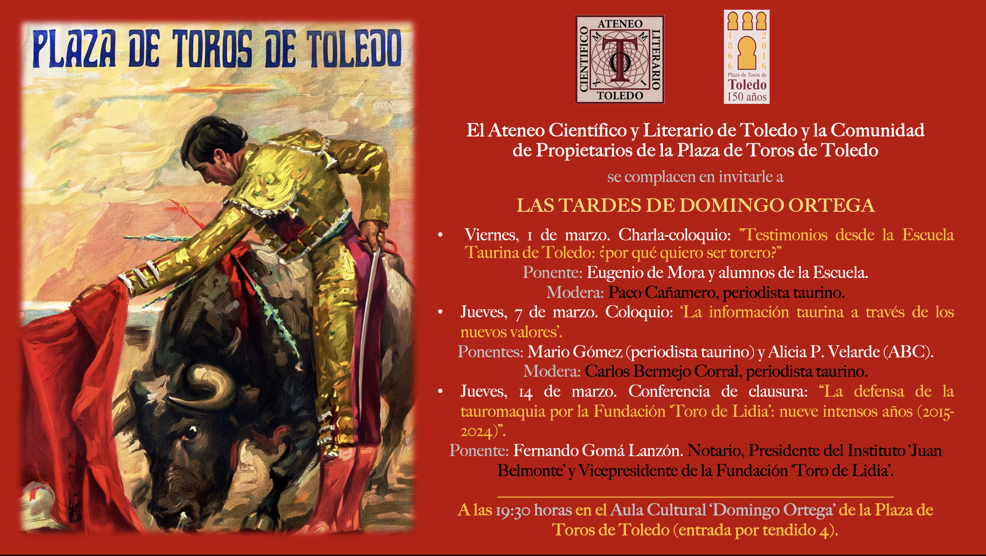 VIERNES 1 MARZOJUEVES 7 MARZOJUEVES 14 MARZO A LAS 19:30 HORAS EN EL AULA CULTURA "DOMINGO ORTEGA"PLAZA DE TOROS DE TOLEDO